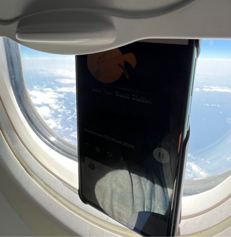 "Op grote hoogte in het vliegtuig luister ik naar Just Your Music Station"